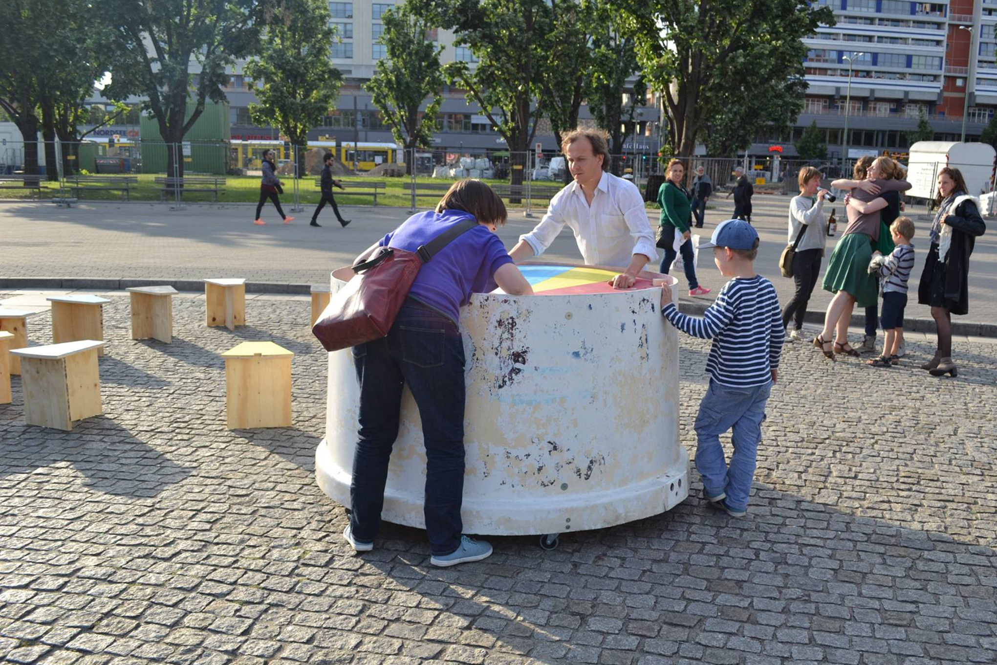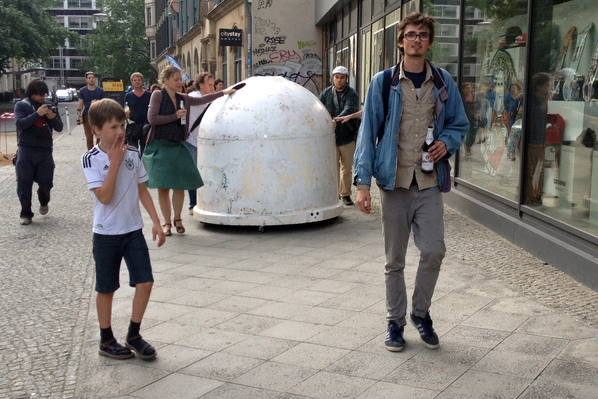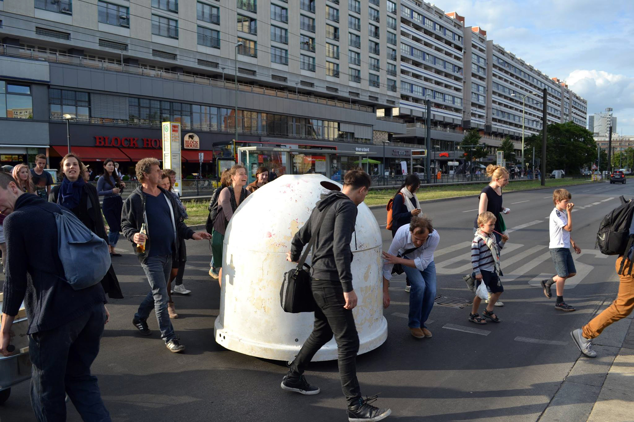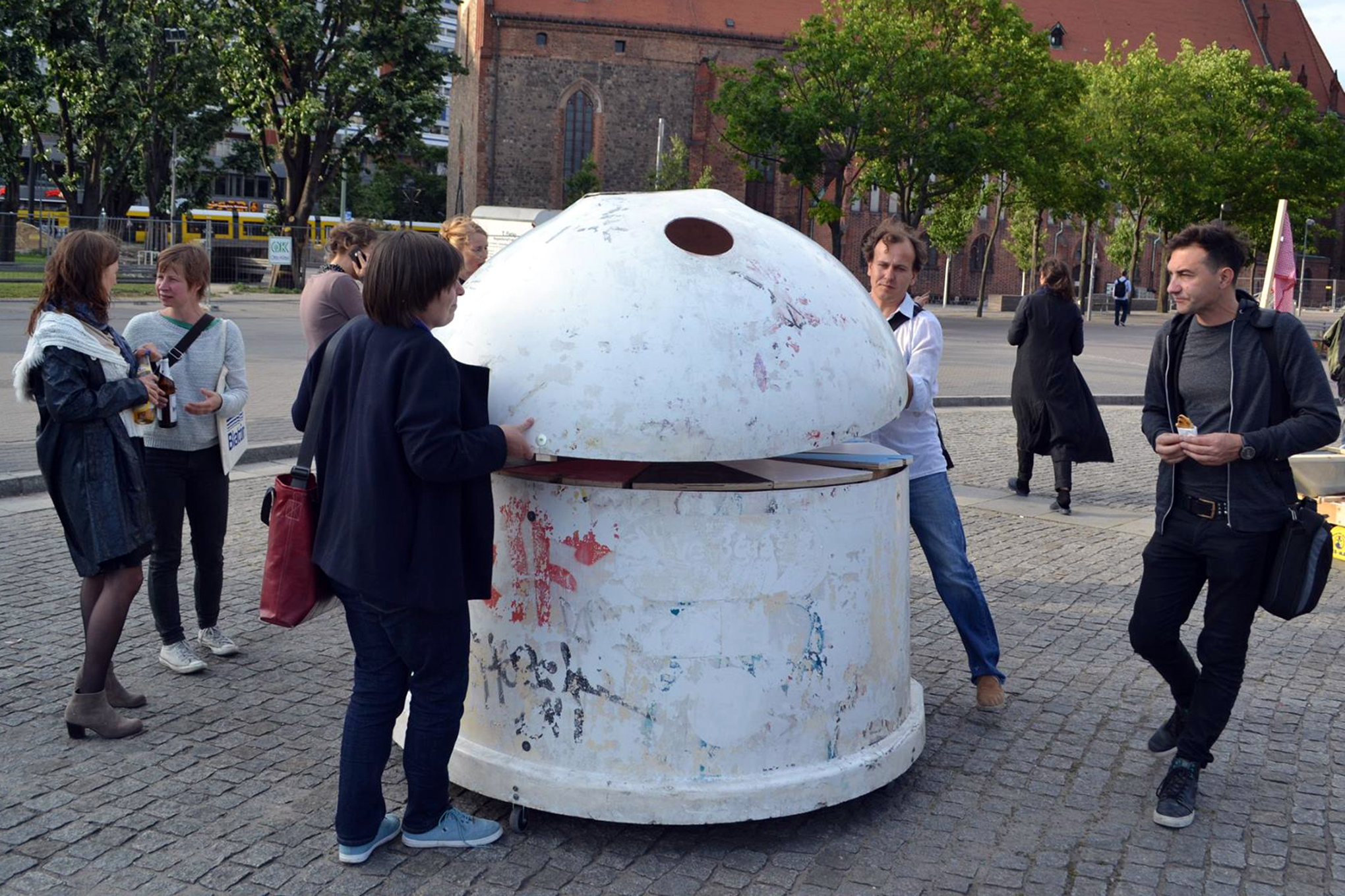 Transstruktura hat für dieser Aktion ein weiteres Objekt der DOM-Serie entwickelt. Ein Glascontainter wurde horizontal in zwei Teile zerlegt. Die Basis wurde mit Sitzgelegenheiten und einer Tischplatte gefüllt und anschließend mit dem oberen Abschnitt wieder geschlossen. Auf Rollen gelagert eroberte DOMobile den Stadtraum als vielfach einsetzbares Mobiliar.