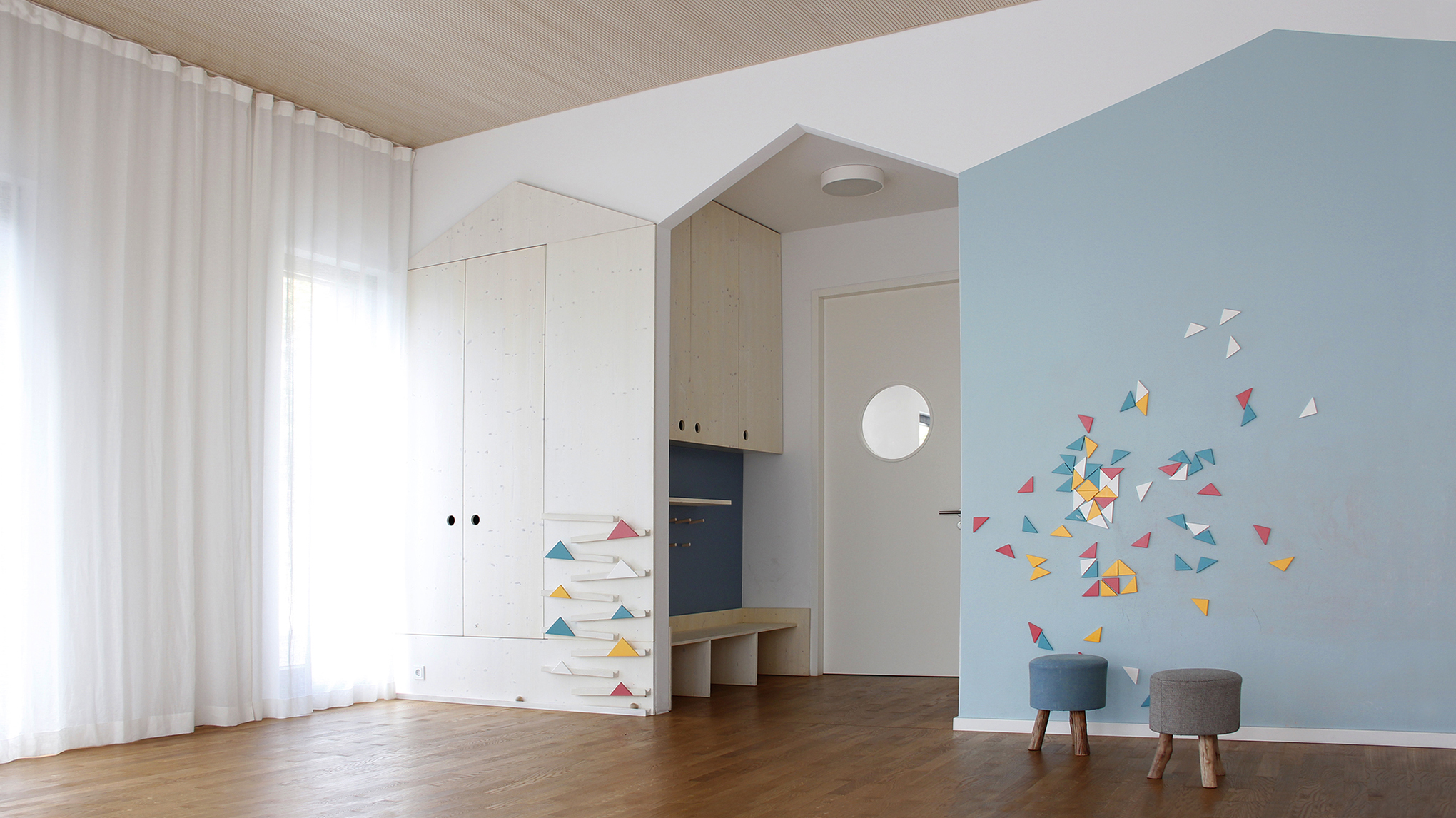 Eine große Doppelflügel-Schallschutztür verbindet den Gemeinschaftsraum mit dem Kinderraum. Der Zwischenraum wird als Garderobe und Rückzugsraum für stillende Mütter genutzt.